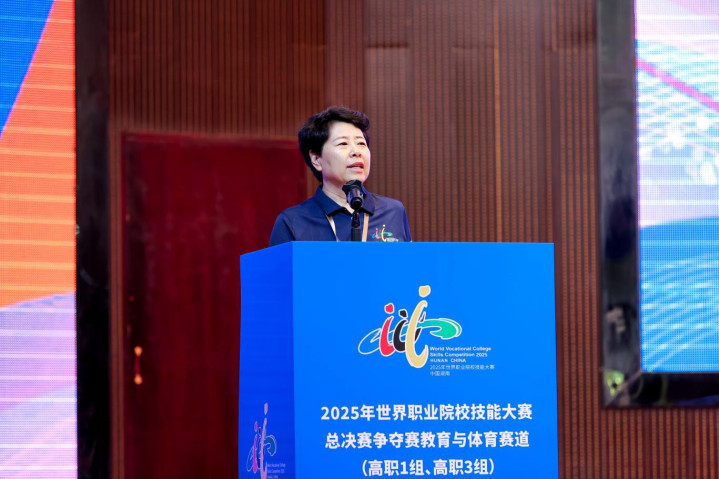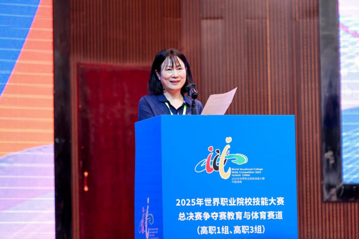 胡湘梅宣读2025年世界职业院校技能大赛总决赛争夺赛“体育与教育赛道”高职1组和高职3组的最终成绩。